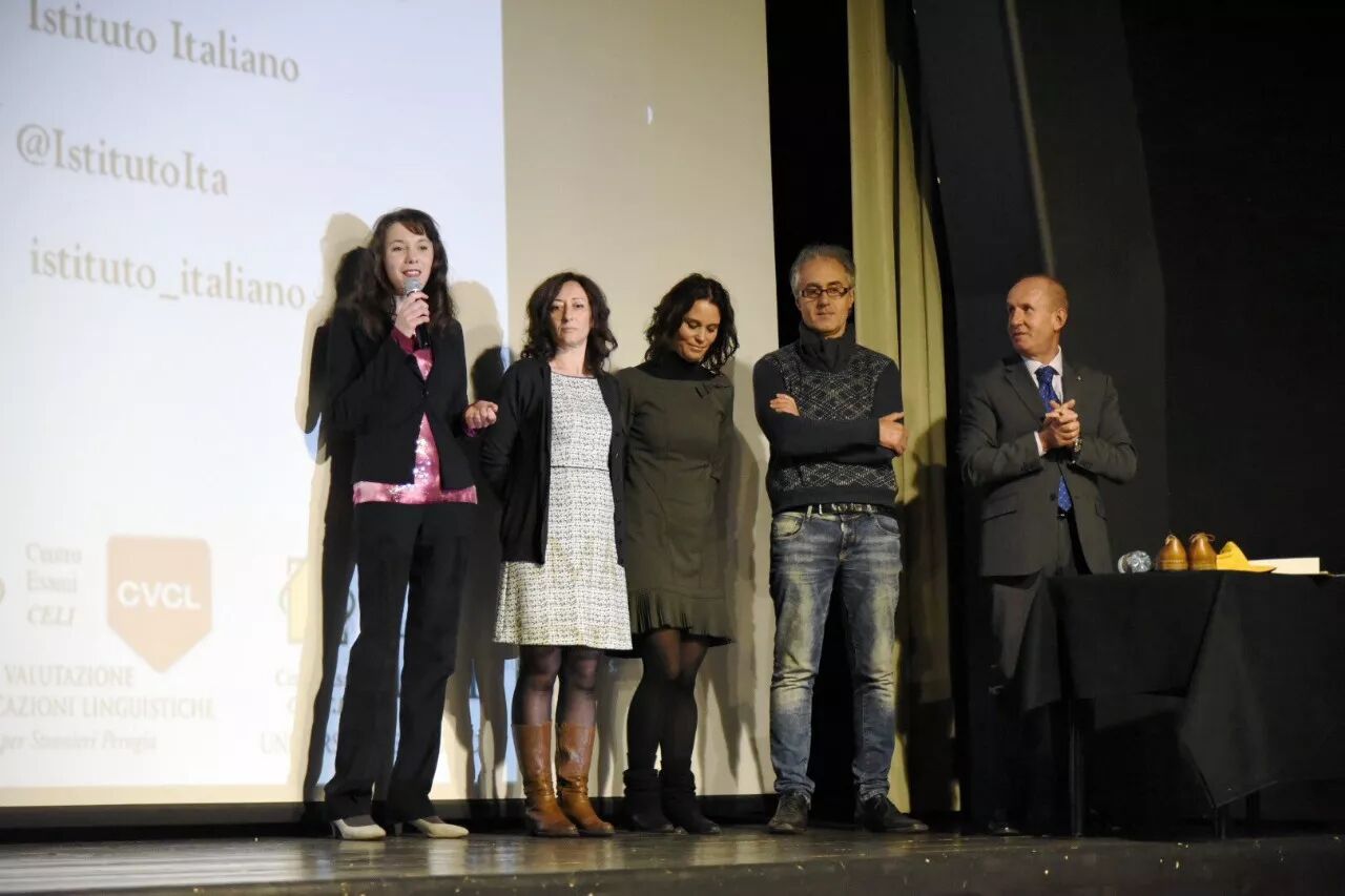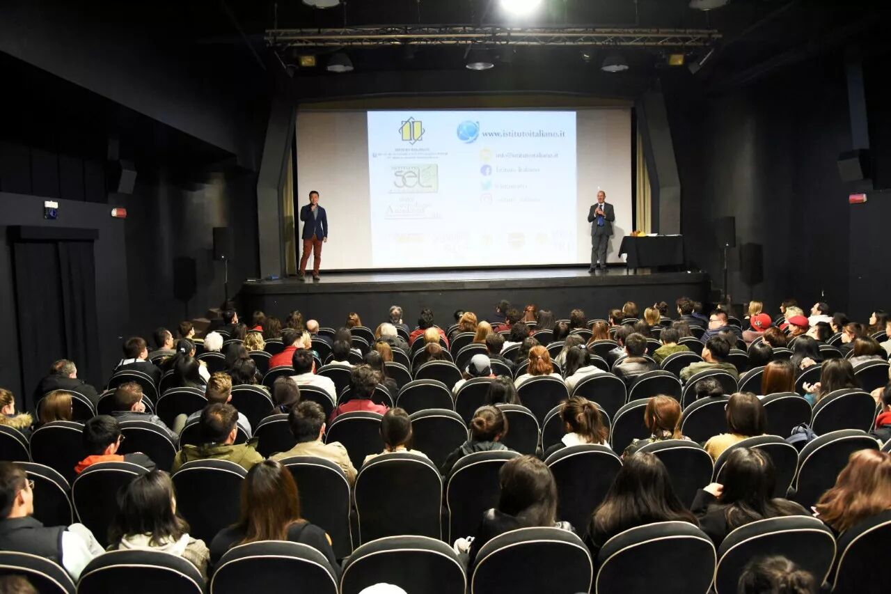 开学典礼上,还举行了师生及校友见面会。该校美术、音乐、设计等专业老师,罗马三大、佩鲁贾大学、锡耶纳大学语言等级认证考试监考老师,佛罗伦萨音乐中心负责人、佛大设计系老师以及该校合作伙伴代表等,分别介绍了各自专业及分管事宜,并就语言等级考试的具体内容和注意事项、语言课程结束后的专业和院校选择、实习等问题一一作了说明。该校往届学生、两位校刊封面女郎也登台亮相,与新来的学弟学妹们互致问候。米开朗东尼奥诙谐地说,学校新一期校刊,将会从中国留学生里面找一位漂亮女生或帅哥,做封面女郎或封面先生。